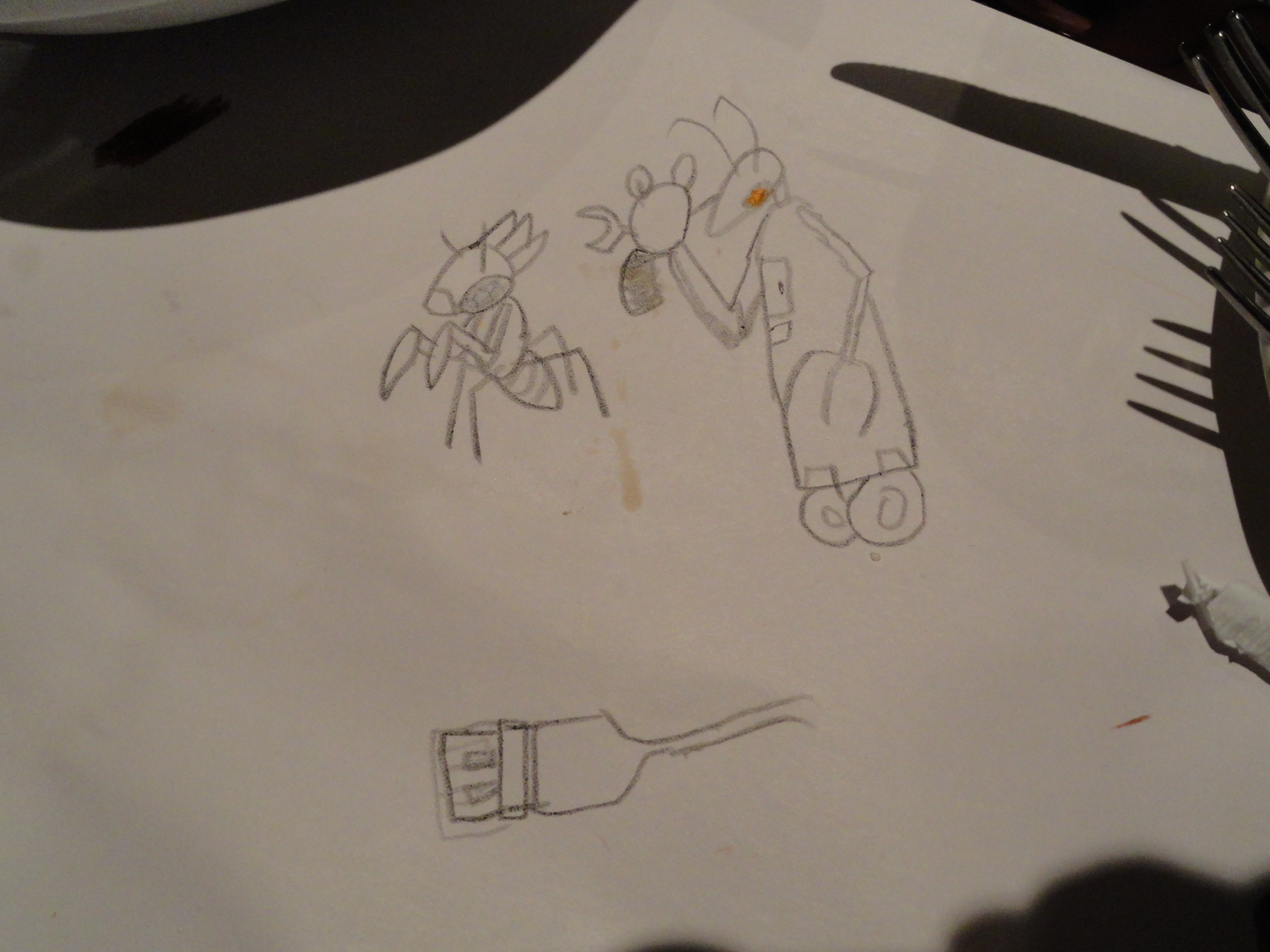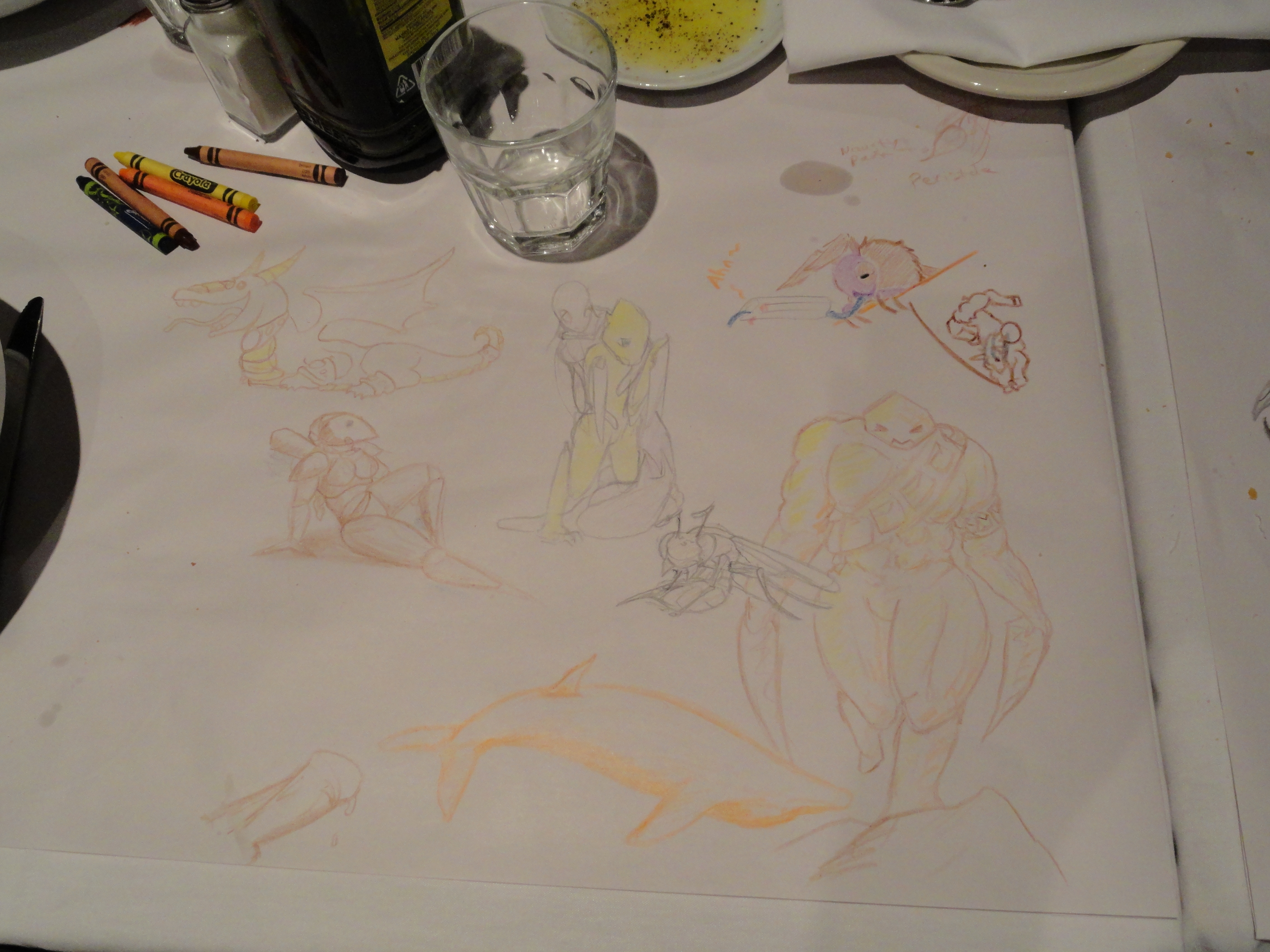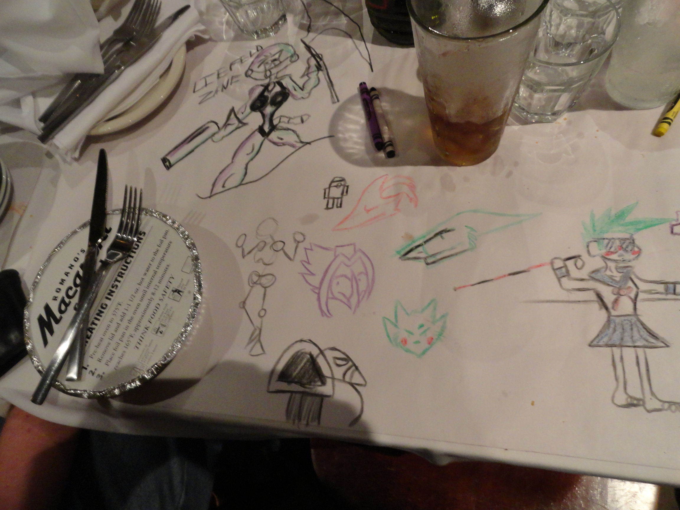 Photos of the table at Macaroni Grill, where we all ate fancy Italian food and drew crap. This is Capt. Slowpoke.