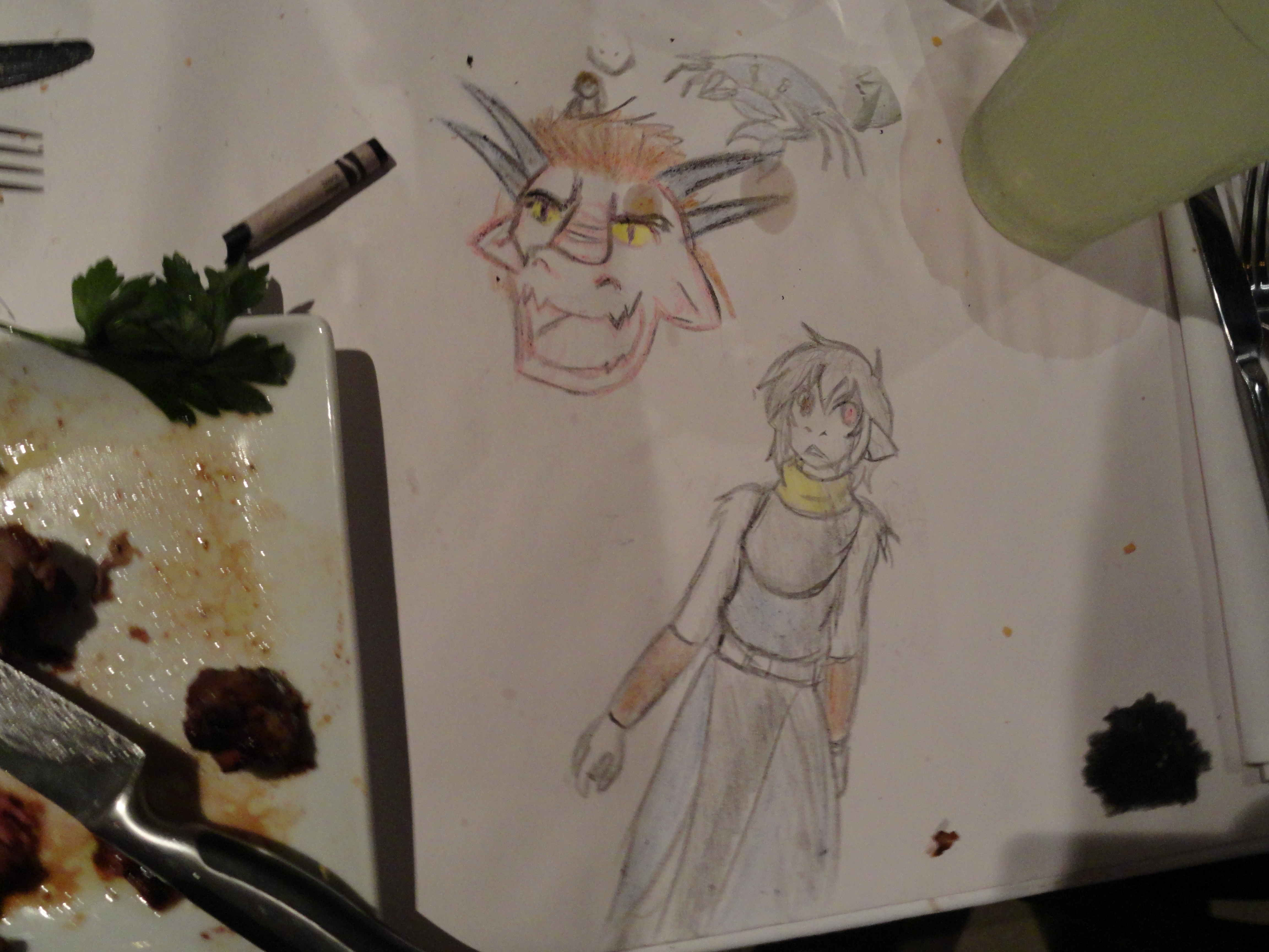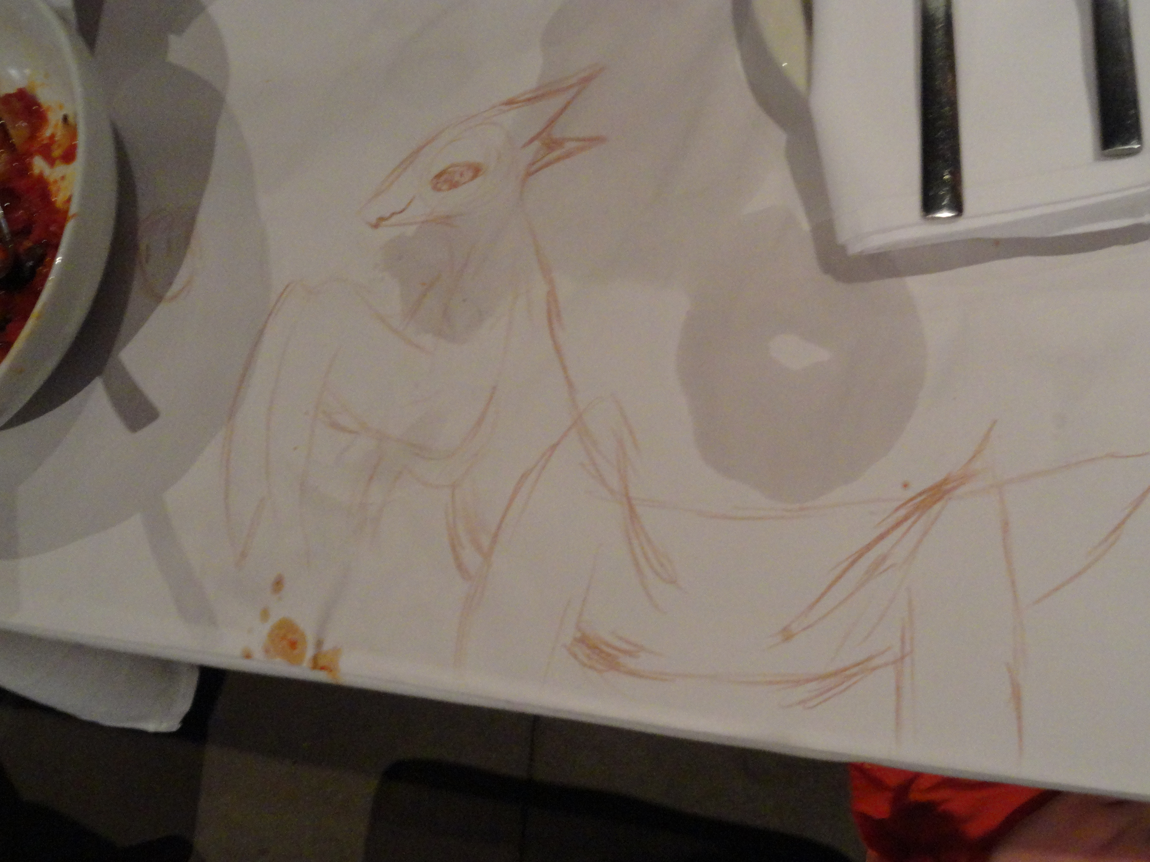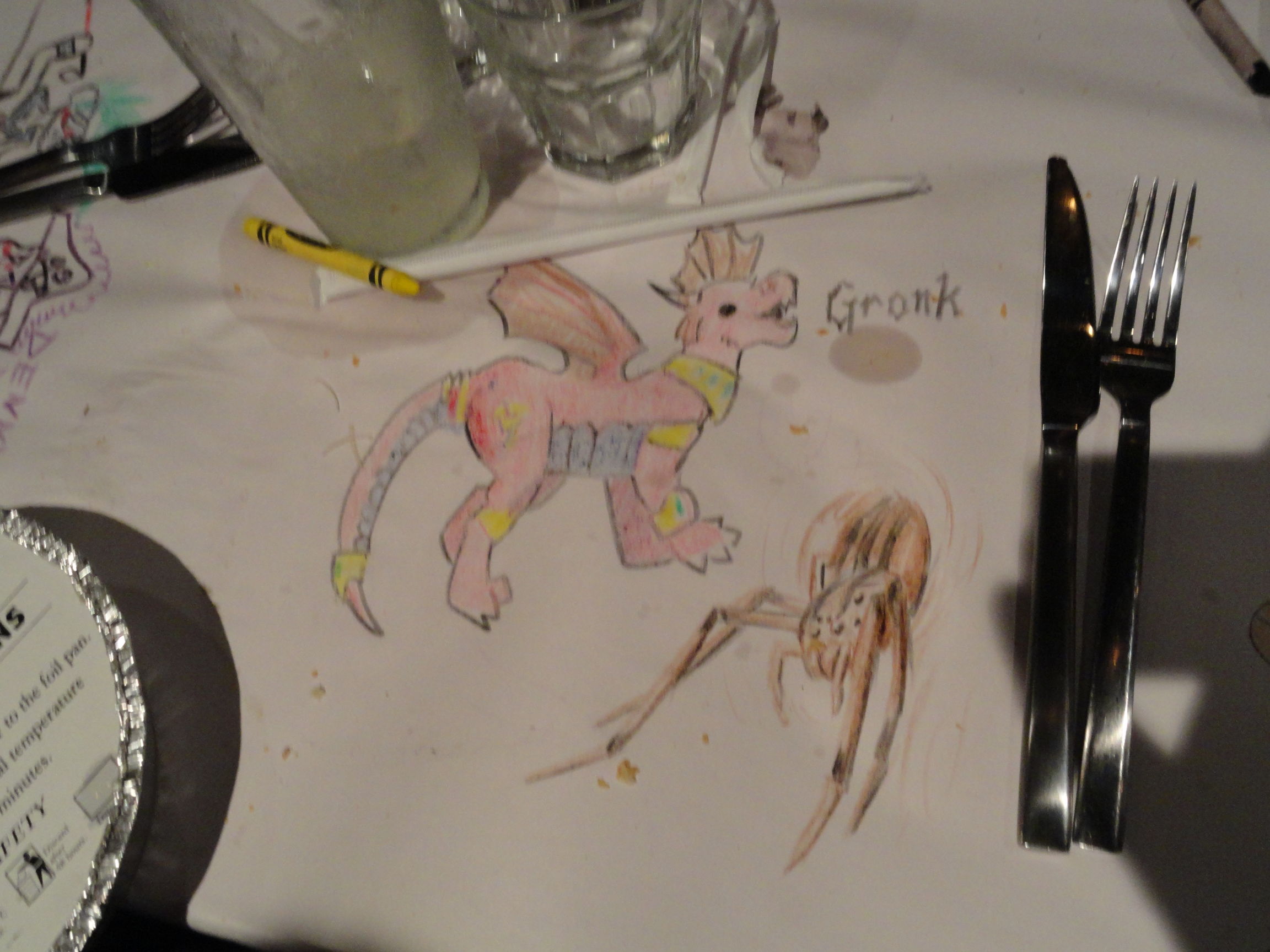 Photos of the table at Macaroni Grill, where we all ate fancy Italian food and drew crap. This is Capt. Slowpoke.