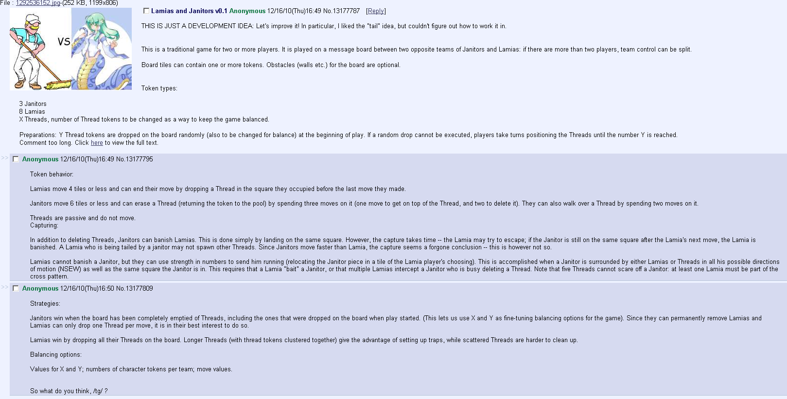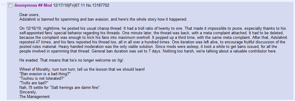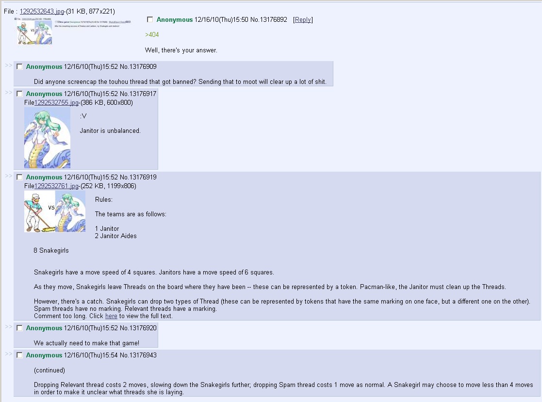 But to be honest, a lot of the current bitchfest has some qualities concerning it that make me suspect that the ban on lamias, touhou, and most any even mildly suggestive material is the result of a moderatorial decision, and that there is a set of rules concerning "board appropriate" material for the janitor, that due to some odd decision isn't showed to the public.