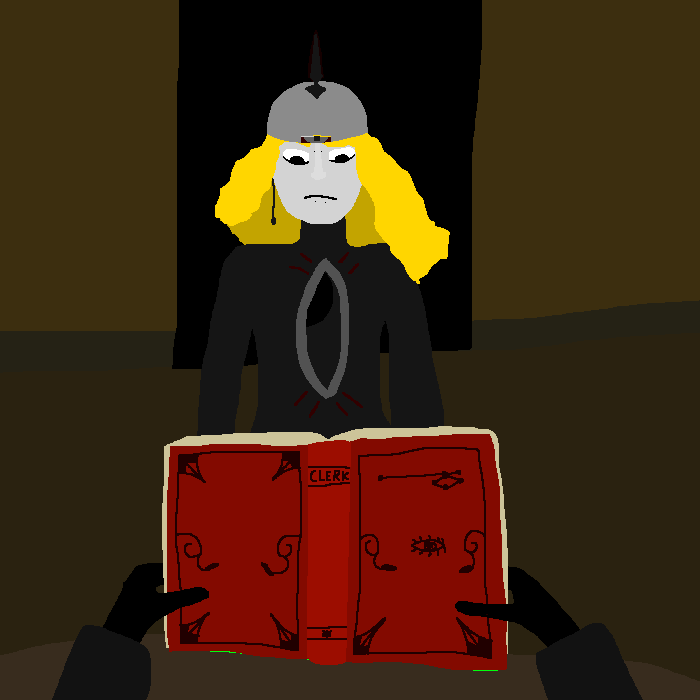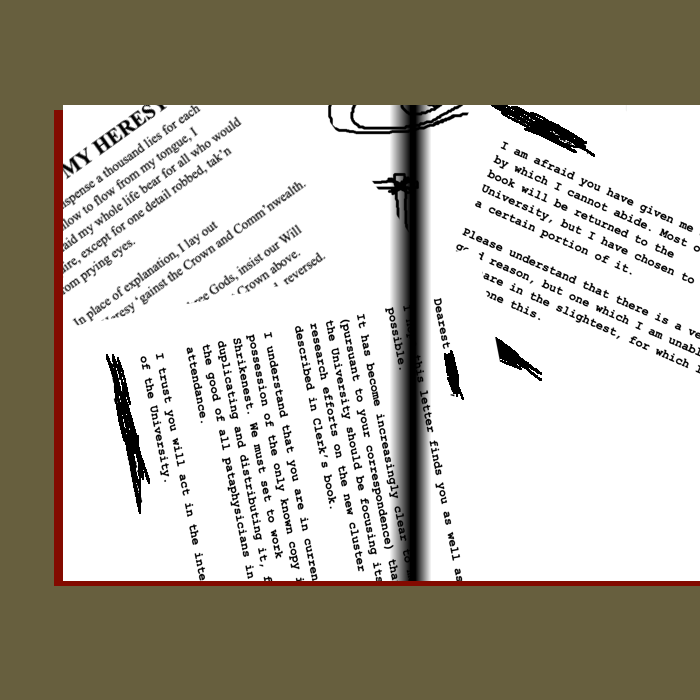 He holds out a manuscript he borrowed from Sam several weeks ago. It is an old family heirloom of hers, or perhaps a regretted but irreversible purchase from some oddity store. Whatever the fact, it’s more of a doorstopper now. It is the second volume of an occult text too rare to toss but not good enough to finish.