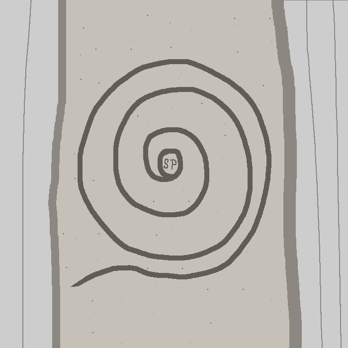 The side of the concrete block facing outwards has had a large spiral carved into it…