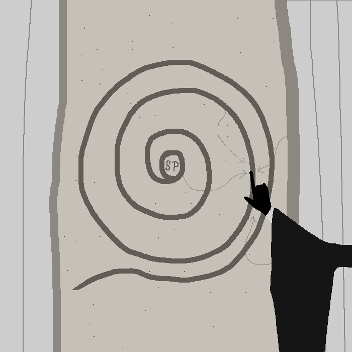Sam puts her hand on the concrete and begins to trace the spiral with her finger, outwards and then inwards.