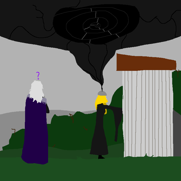 A recluse clothed in black is yanked from her practical study by a knocking at the door. Whatever shadows she was conjuring retreat back into the corners.