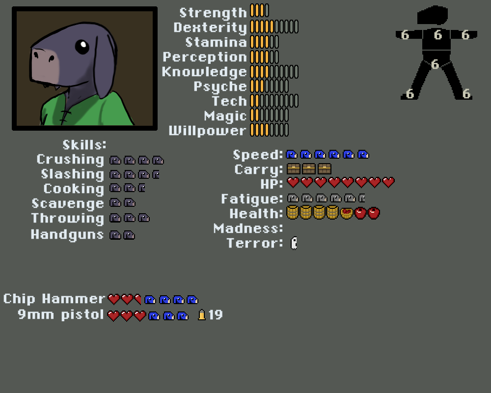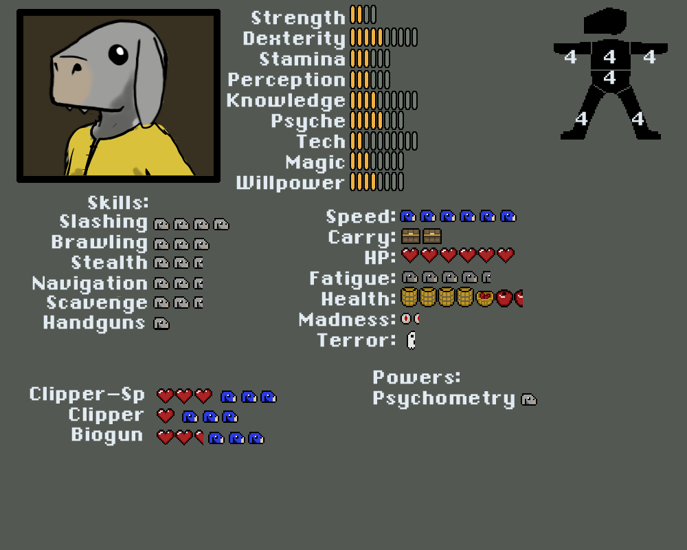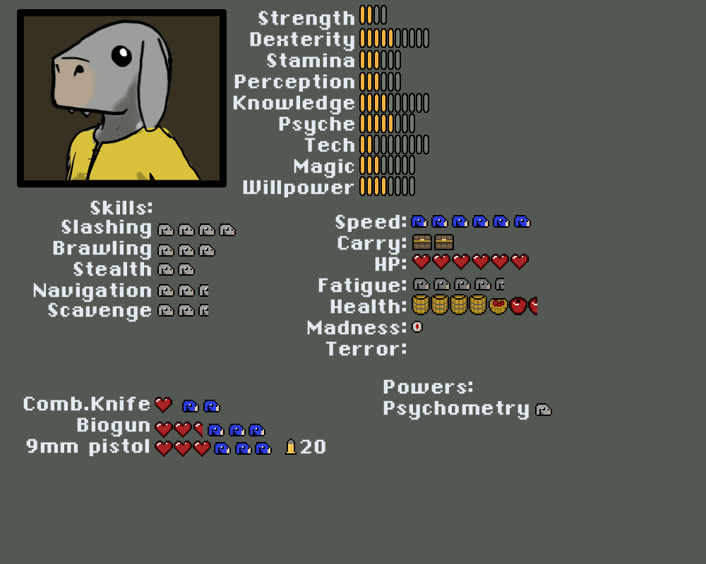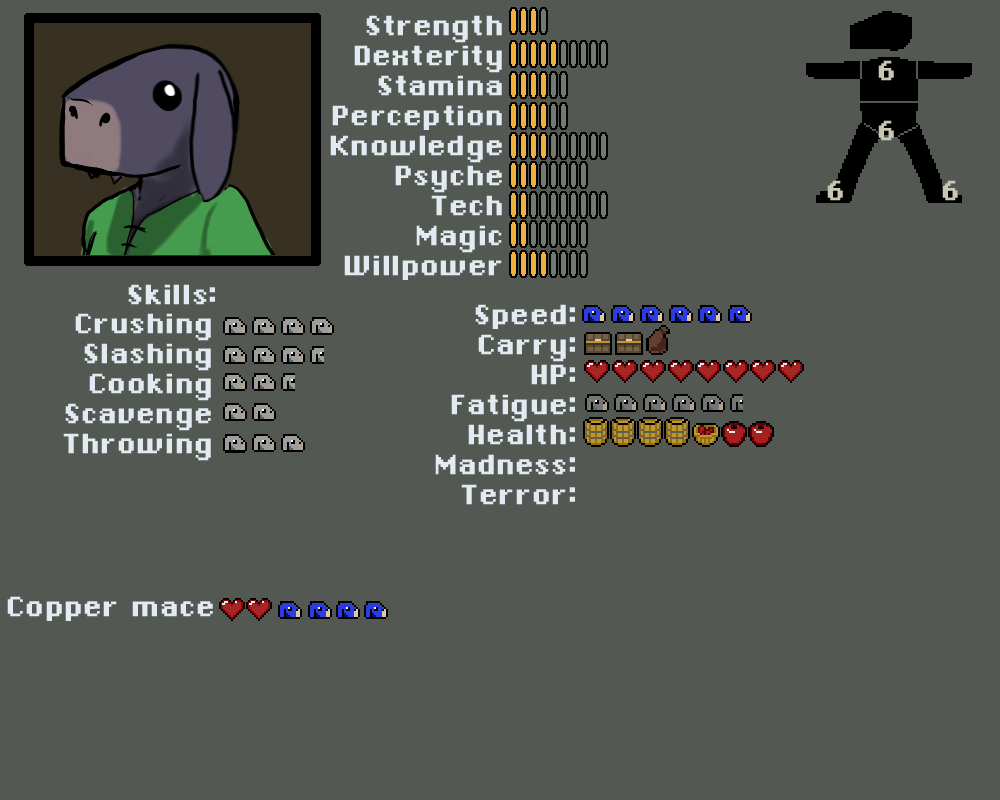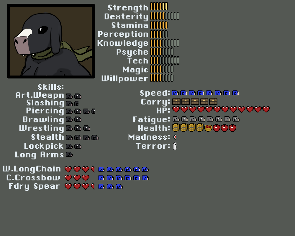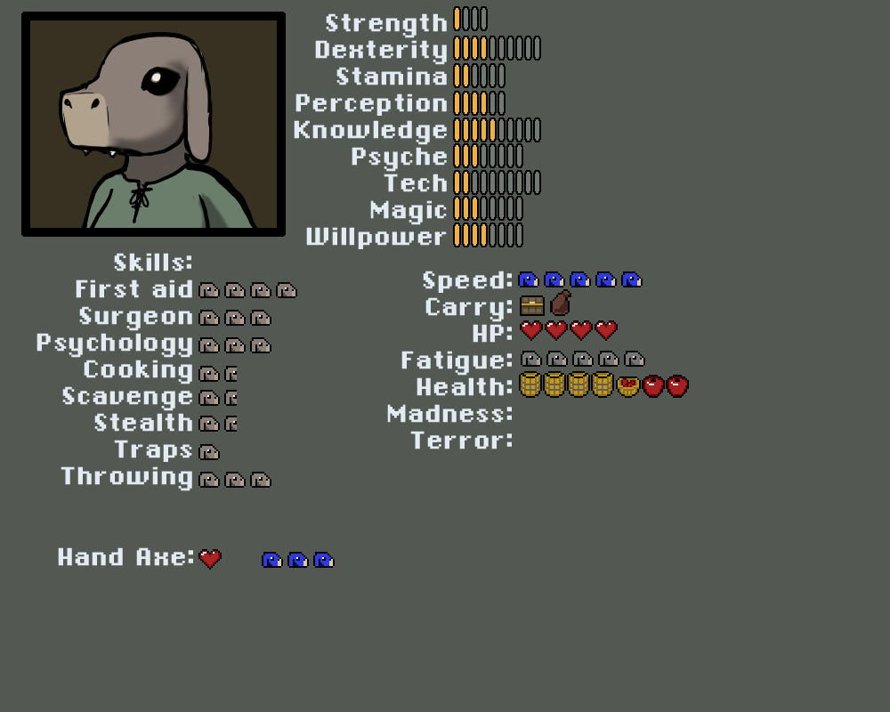 Madness, Terror. Rolled against when a kobold has to take a check for seeing something that breaks reality or is terrifying. Goes up on a failure, and also acts as resistance for future madness/terror checks. Kobolds start behaving erraticly if either one gets too high.