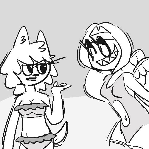 She decided to take the swimsuit from the trashcan after Arthurius left the room and wear it for the beach day event just to mess with him… however, although she is wearing this to tease Arthurius and commit to the joke, this swimsuit is rather… revealing, and not something she would usually be caught dead wearing. It even brings butterflies to her stomach just thinking what the other beach goers might think of her if they saw her wearing this. But she shrugs it off with this reason that she explains to Magnolia: