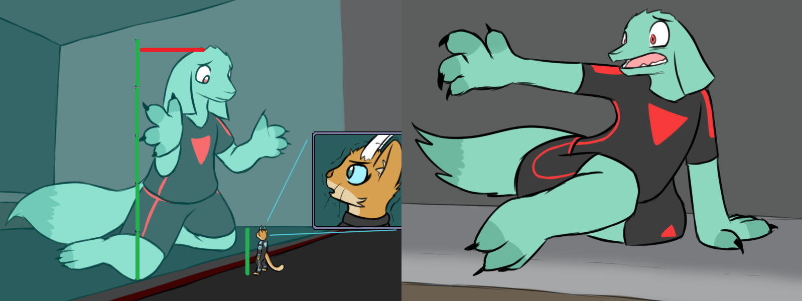 I say it's the women's uniform because Orro doesn't wear one. That said, it could just be that Orro gets a different set of clothes 'cuz hes a subject. If we ever meet another researcher who's not a girl, maybe we'll get to see a different jumpsuit. Who knows. Another detail is that the armband on each jumpsuit's left arm shares one specific thing - the triangle on it has been drawn in #000000 black, as opposed to the #3D3D3D grey of the jumpsuits. This is consistent with every depiction of the triangle so far /except/ for the triangles on the back of the jumpsuits, which are coloured accordingly to the clearance of the wearer. That said, you may have noticed that orro's red triangle is on the /front/ of his shirt.