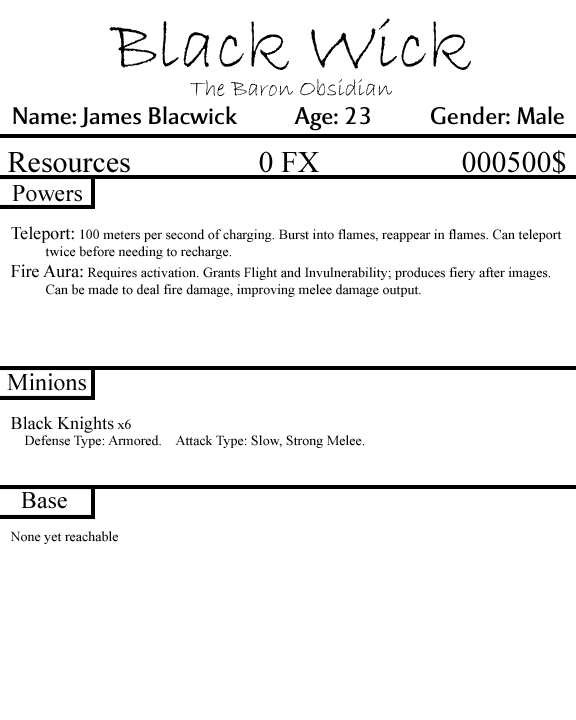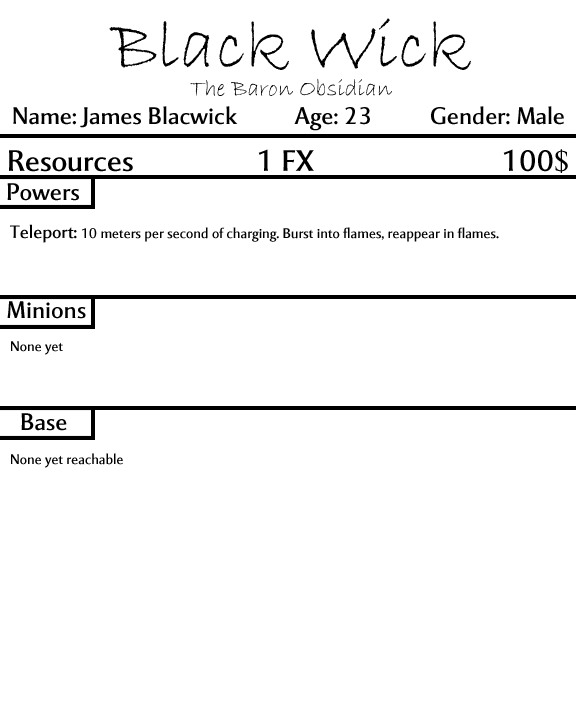 Really I think the focus should be on getting Blacwick some cool villain friends and a hot girlfriend who doesn't mind wearing tight black leather clothing and joining in on the villainy business. Villainy in itself doesn't really GO anywhere. I mean Blacwick's dad had a moon base with ninjas, but he abandoned his son and got killed using up all his resources.