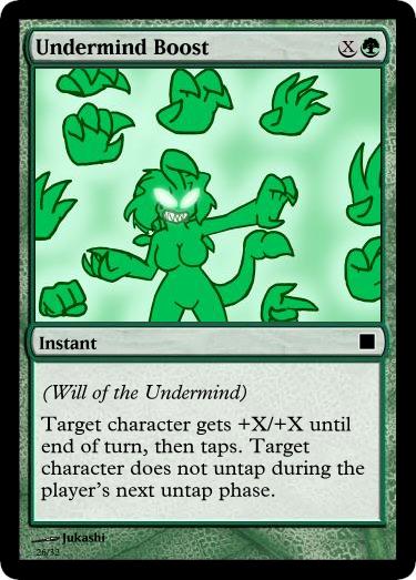 >Undermind Boost should be split up into two sections: the +X/+X, then 'At end of turn, tap that character. It doesn't untap during the player's next untap phase'. The phrasing for that is just icing on the cake. :3c