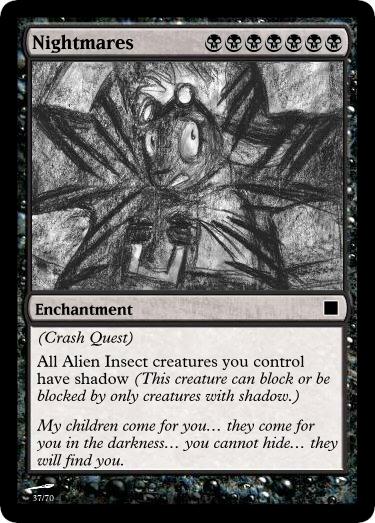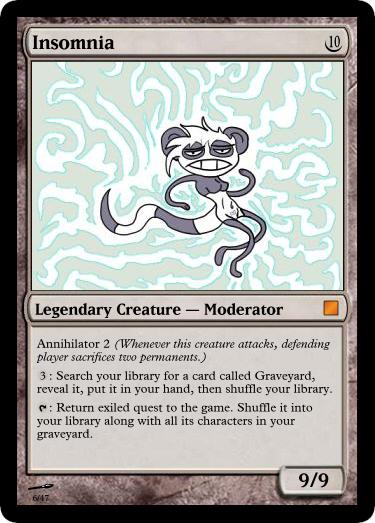 >Insomnia's third ability is not phrased correctly. I don't remember off the top of my head what the correct phrasing is though, but it's something along the lines of 'Shuffle target face-up exiled quest into your library...'