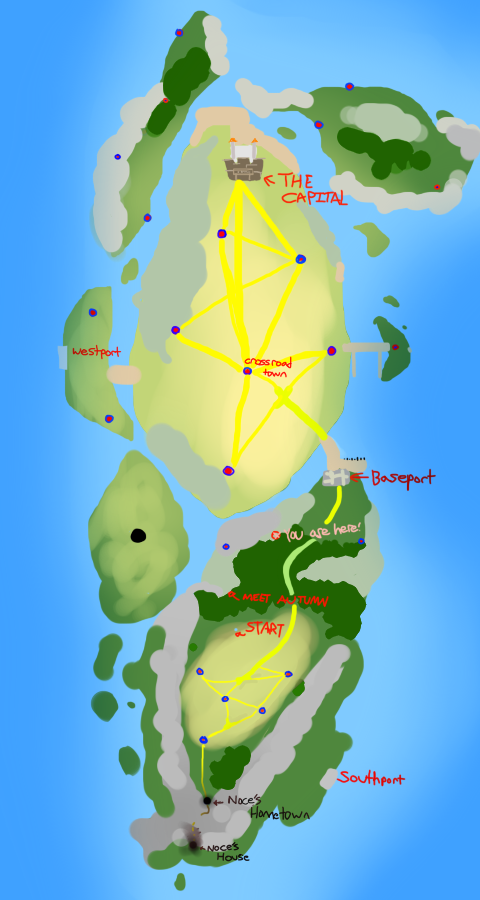 Red dots with blue circles are towns, blue dots with red circles are abandoned towns, and black spots are areas Noce will avoid at all costs. The bigger areas of any importance are labeled.