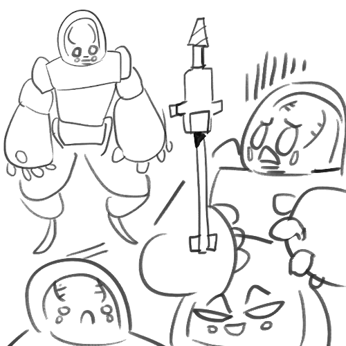 Ketzas have fire magic but for extra blasting power this one rides a mech (making her about Asteroid Knight’s size overall). A ball body with a big turbine looking thing that it uses to shoot beams with the pilot on top. The kirby invader mechs are a good idea of the general shape.